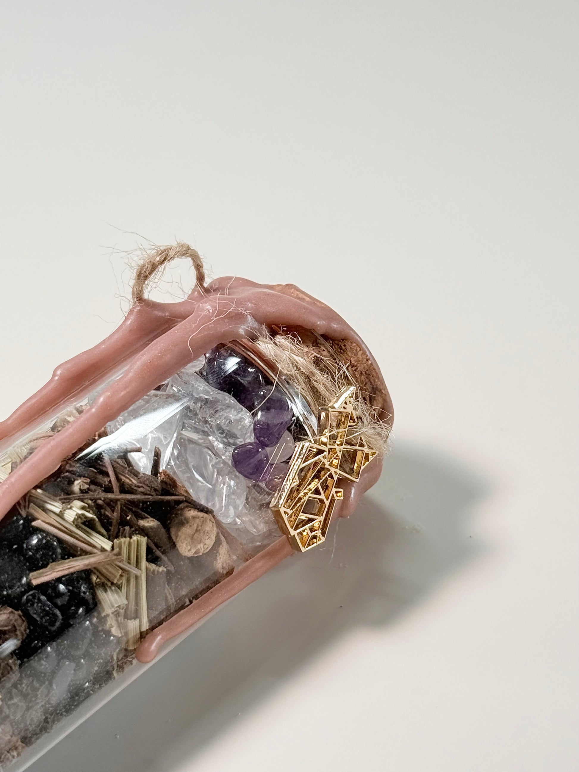 [Lavender, black pepper , Obsidian, Lemon grass , Artemisia Argyi, St. John's Wood, Peony root, Angelica Slices, Sandalwood, Clear Quartz, Amethyst]